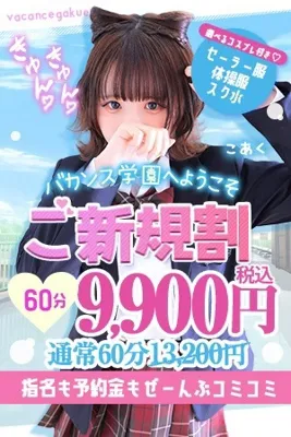 | 3,300円OFF! ご新規割 60分 | 13,200円 | 9,900円 | ☆ご新規割☆初めてのバカンス学園♪※ご新規様限定!※詳しくはお問い合わせください。 |